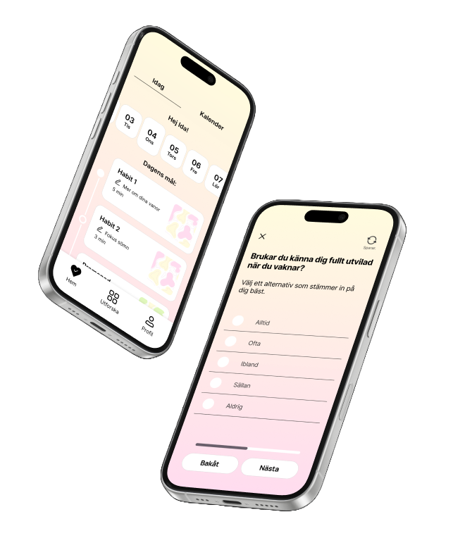 När vi hade skapat onbarding-flödet, valde vi att återanvända dess upplägg i “dags-vyn”, i form av “Habits”. Detta underlättar ytterligare inmatning av information för användaren, eftersom frågorna blir uppdelade i tematiserade “block” som sprids ut under en längre tid.