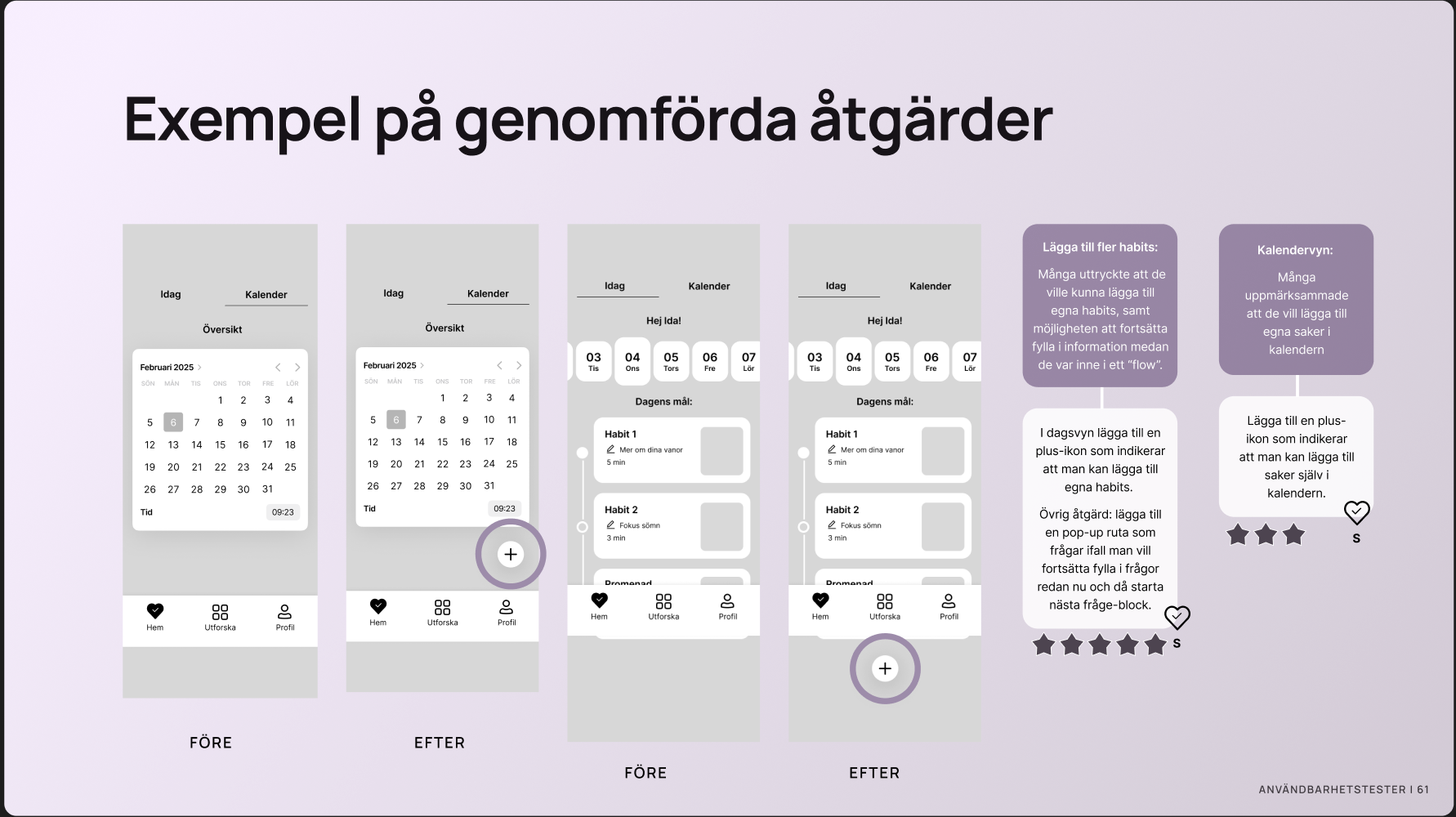 Vi testade även appens generella flöde för att utvärdera hur användarvänligt och naturligt det känns att navigera mellan olika vyer.