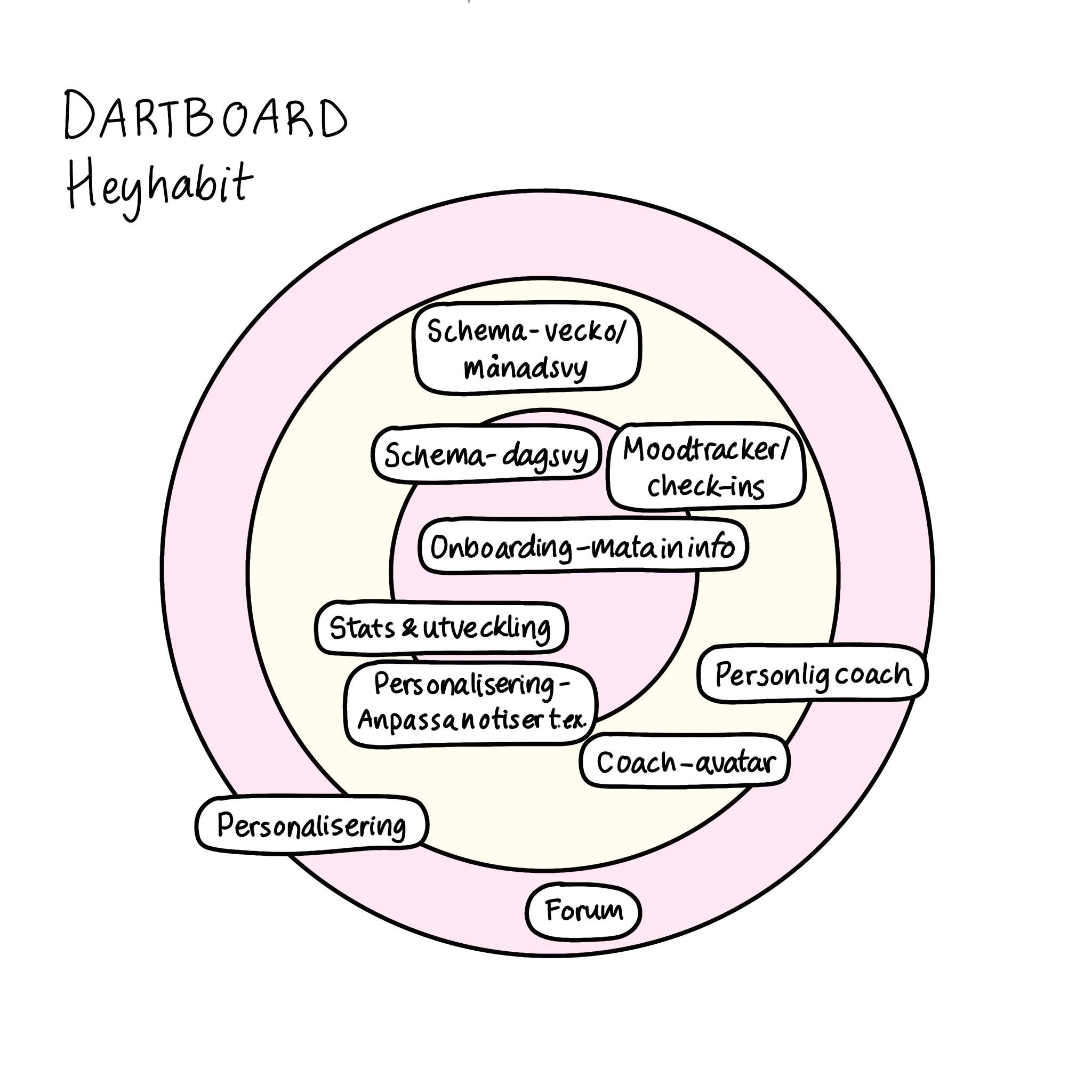Utifrån dessa två dartboards valde vi att fokusera på “Onboarding - inmatning av information”, för att det är en vital del som gör att Heyhabit ska fungera och ge så bra hjälp som möjligt.