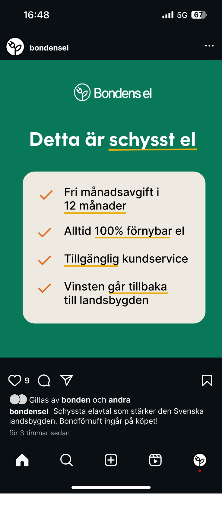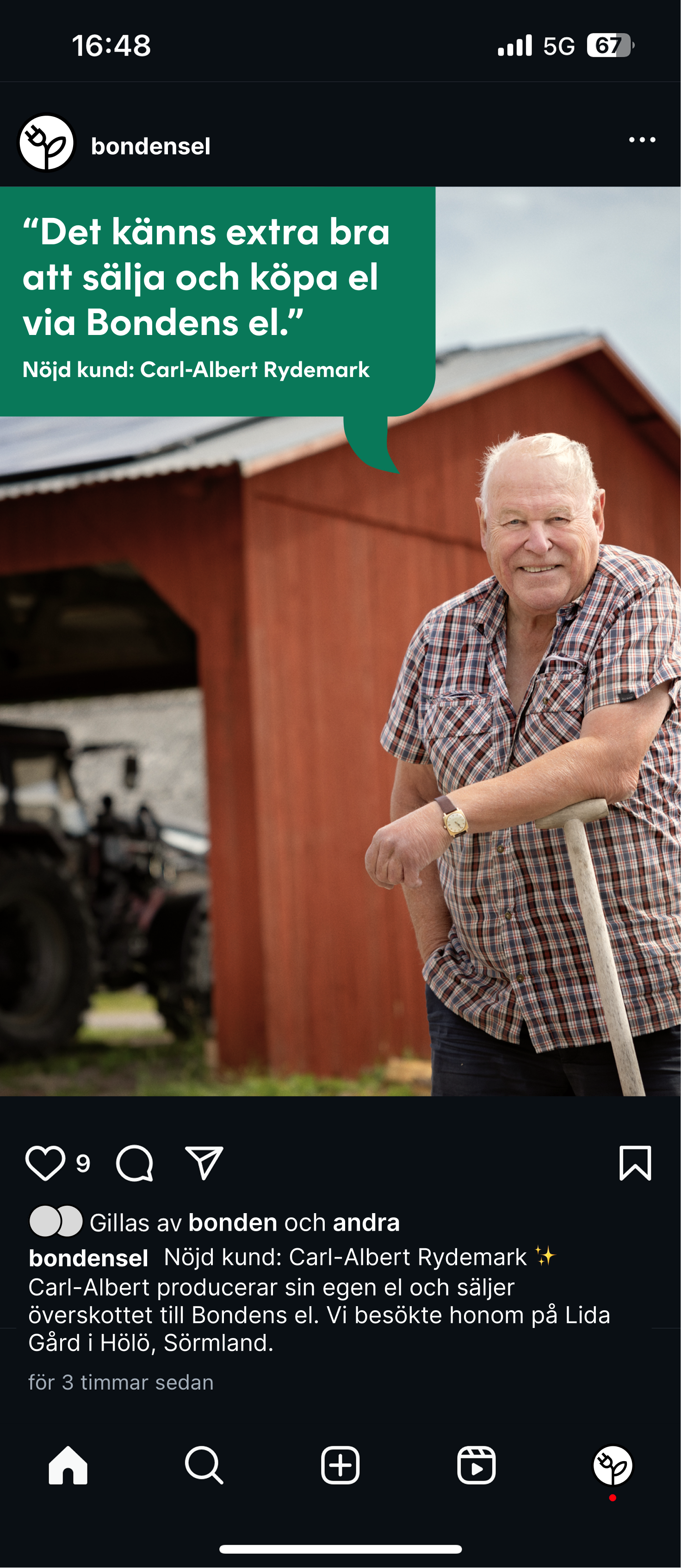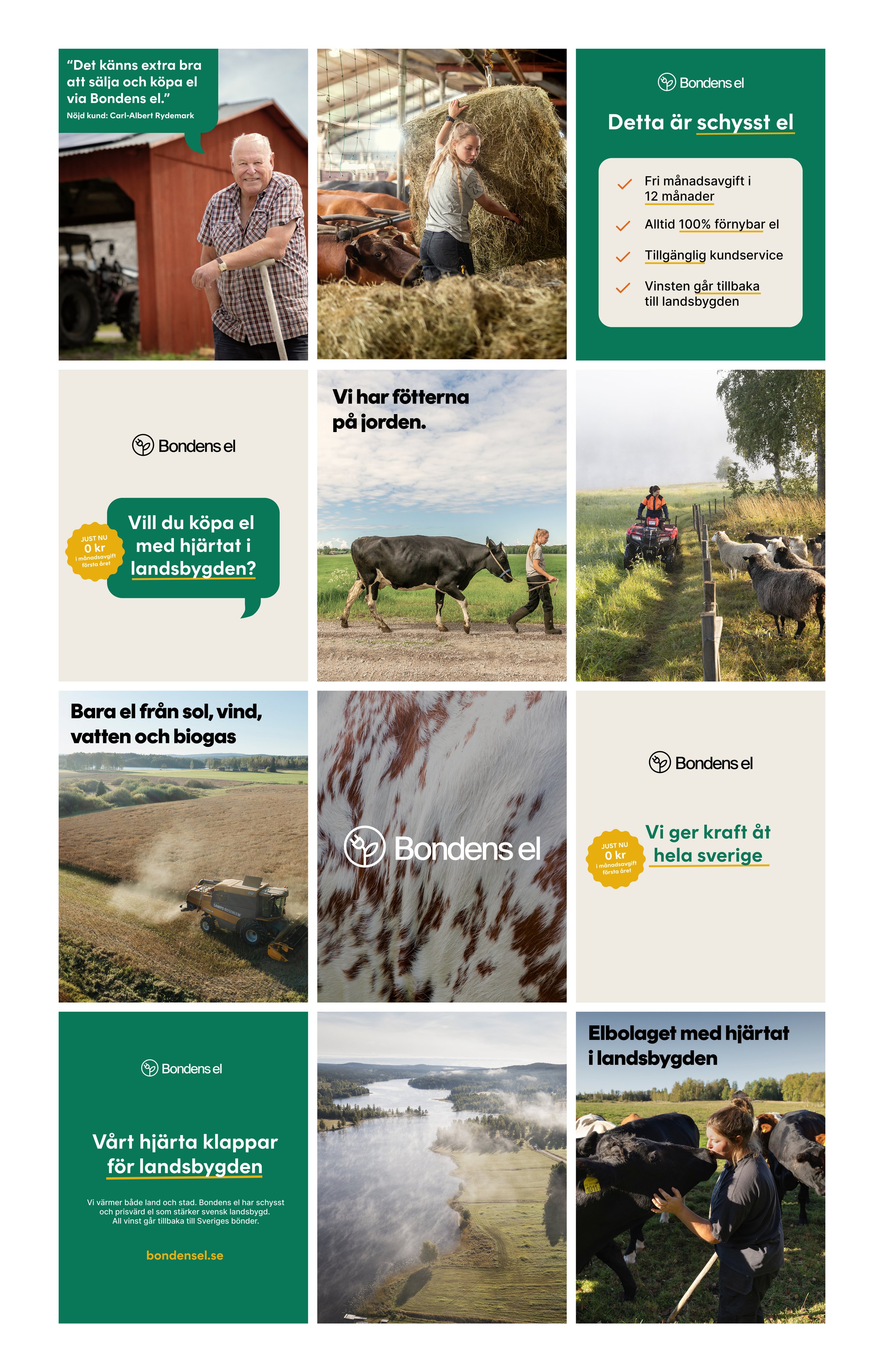 Bondens El är ett energibolag som ägs av svenska bönder och helt drivs av förnybara energikällor. När jag fick uppdraget fanns deras Instagramkonto, men utan ett enda publicerat inlägg. Målet var att etablera en närvaro på plattformen, utan att behöva skapa eller underhålla löpande innehåll.